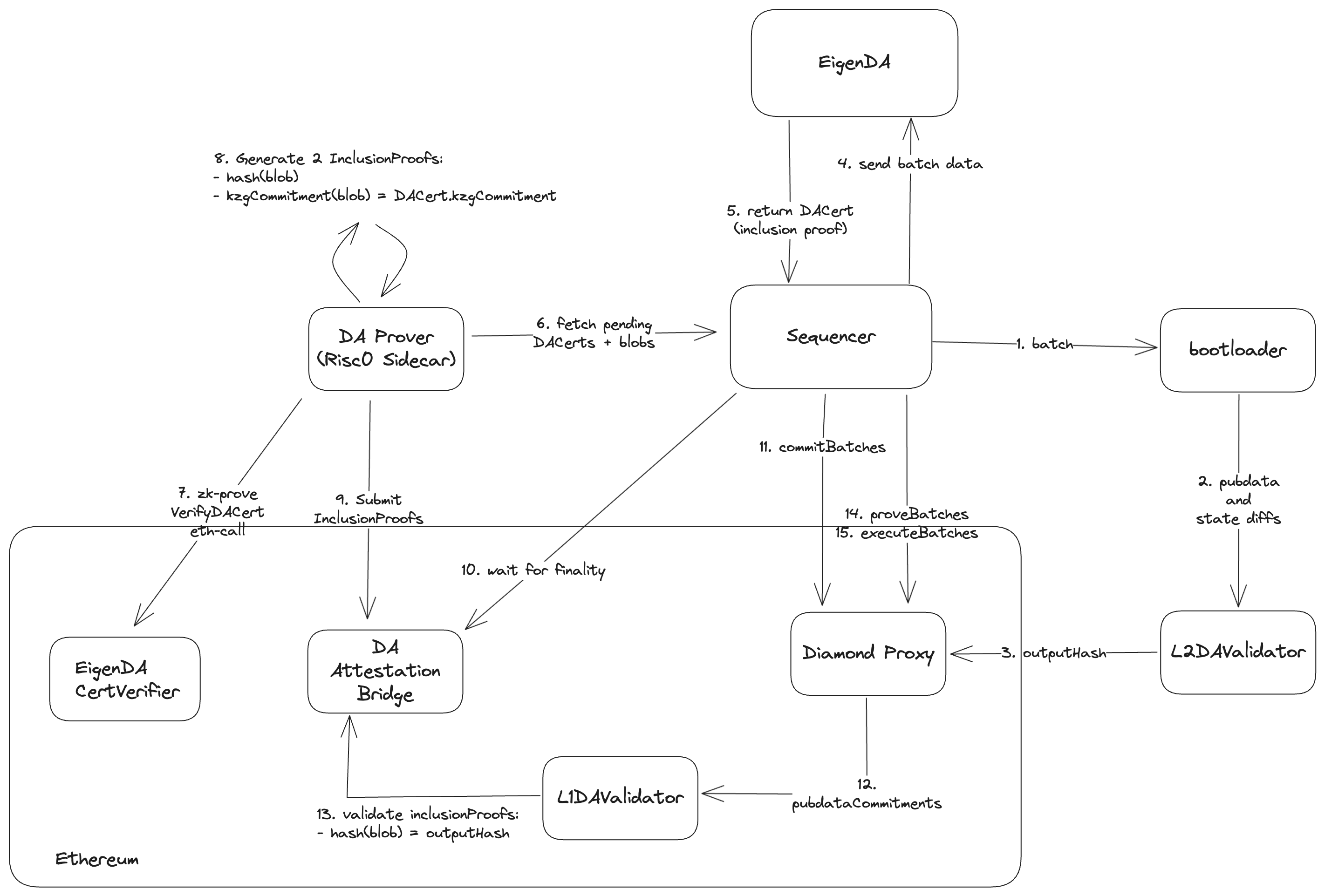 In the stage 2 model, in order for ZK Stack's prover to remain AltDA agnostic, their Validium architecture mandates that a sidecar prover is used to prove the inclusion of the compressed state diffs on EigenDA, to the L1. We use Risc0 for this sidecar prover.